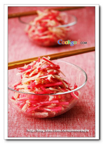 1、调味汁要在食用前再淋入,以防止柠檬汁使萝卜丝变软,失去了清脆的口感。