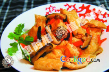 材料:豆卜(450克)、干香菇(3朵)、红椒(1只)、姜(1小块)、高汤(半杯)