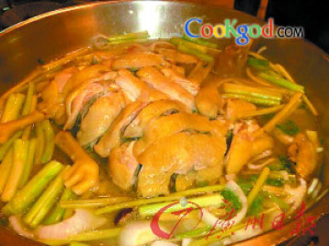 做法:鸡去毛去内脏,洗净备用;唐芹洗净切段备用;开锅,烧开鸡汤,下适量盐调味,将火调至水微沸状态(虾眼水),放入鸡浸煮约15分钟左右至熟,再把鸡放入冰冻的味水中“过冷河”,斩块上铜盘,然后放入唐芹、葱白和沙姜片,倒入少许煮鸡的汤汁,滚开后便成。