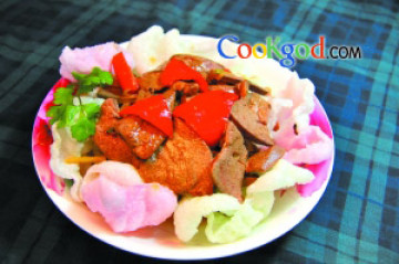 7、将炒好的猪肝片盛入炸虾片上,淋入汤汁,即可出锅。