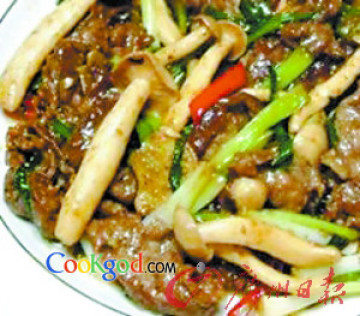 材料:肥牛400克、鸡腿菇100克、xo酱20克、泰椒5克、干葱20克,花生酱少许,盐、糖、鸡汤、花生油、麻油各适量。