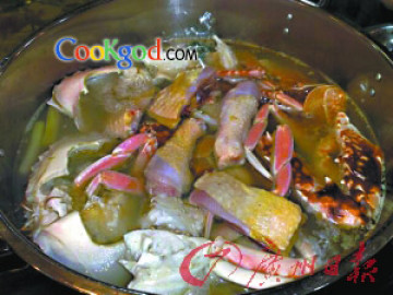 做法:蟹宰好洗净,斩件备用;花甲洗净备用;药材用花雕酒浸泡片刻,入蒸炉蒸5分钟,取出备用;光鸡斩件,用盐、糖、胡椒粒、麻油、生抽、花生油、花雕酒腌制20分钟,开窝下鸡汤、姜片、葱段和草菇煮开,下药材、蟹、花甲中火煮5分钟,然后放入鸡、唐芹和豆腐小火煮熟,调味便成。