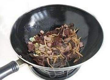 4)锅中再倒入油,油热后放入大葱片爆香,倒入猪里脊片炒至变色后,放入木耳片和黄花段翻炒几下,调入酱油,盐,糖和少许水,继续炒2分钟。