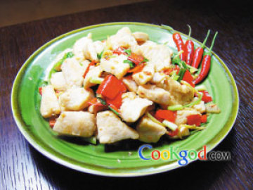 制作前将鸡腿去骨,剁成适口小块,然后洗净。将泡红辣椒、泡姜剁细剁碎。将大蒜瓣切成薄片。大葱切成段(约1寸长),放入蛋清、水淀粉、盐和鸡精与鸡腿块搅拌均匀,盛于玻璃器皿中用盖密封3-5分钟。