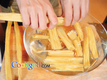 1、支竹掰成段,放进清水中泡一小时,直至支竹泡软。