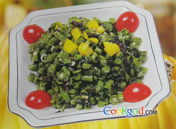 主料豆角500克。辅料香港橄榄菜200克,胡萝卜5克。调料精盐15克,味精10克,香油5克,花椒油100克。