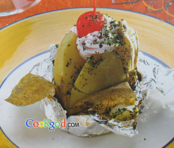 3、将烤熟土豆切十字刀,剞成花状,挤上酸奶油,撒上香菜末。