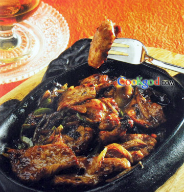 2、烤盘内加入油用高火微波2分钟,放牛肉、洋忽、青椒和调料,再用中火微波5分钟即好。
