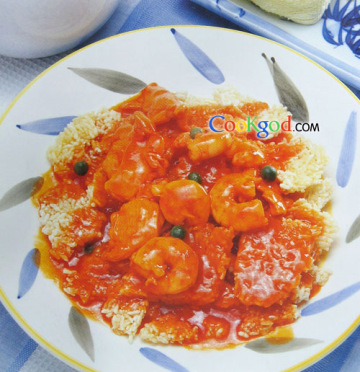 2、炒锅注油烧至七成热,投入锅巴,炸至浮起捞出。将鸡脯、虾仁放入油锅,至变色时捞起。另锅放清水、番茄酱,白砂糖烧沸,调好口味,盛入汤碗中。
