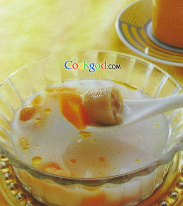 此汤美容点:(部分摘自网络) 木瓜内含丰富的木瓜酵素、木瓜蛋白酶、凝乳蛋白酶、胡萝卜素等,是一种营养丰富、有百益而无一害的“果之珍品”。其中,木瓜酵素中含丰富的丰胸激素及维生素a等养份,能刺激女性荷尔蒙分泌,并能刺激卵巢分泌雌激素,使乳腺畅通,具有神奇的丰胸功效;此外还可分解脂肪,去除赘肉,促进新陈代谢,及时把多余脂肪排出体外,从而达到减肥瘦身的目的。 猪蹄内含有大量的胶原蛋白,被人体吸收后,能促进皮肤细胞吸收和贮存水分,防止皮肤干涩起皱,使面部皮肤显得丰满光泽、富有弹性,还能加快青春痘疤的愈合。使皮肤光滑细腻。