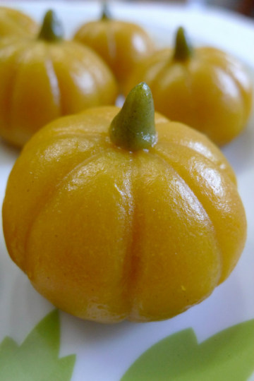 南瓜泥200克,糯米粉200克,澄粉(小麦淀粉)50克,绿色(菠菜汁)面团少许,豆沙150克
