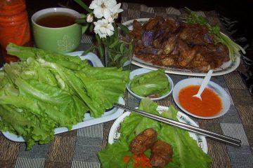 用生菜裹着一/二块矮瓜,点一点私房蘸料送入口吧!