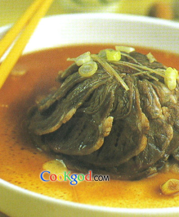 3、把蒸好的牛腱子肉扣在鸡蛋糕上,浇上海鲜酱油,撒上葱花、姜丝,最后淋上1大匙热油即成。