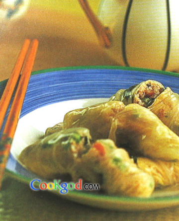 2、猪精肉切成丝,滑油,与其他原料丝调味均匀,放在白莱叶上卷成6个同大的白菜卷,放蒸锅内蒸6分钟取出摆在盘内。