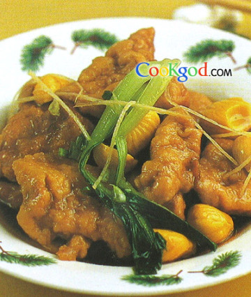 2、锅中加油,烧至四成热时,将肉下入,炸至外酥里嫩成金黄色捞出,和栗子拌在一起,加酱油、味精、姜丝、油菜入蒸锅蒸5分钟即成。