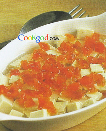 将原料中的咸鸭蛋黄改为蟹黄,称为蟹黄蒸豆腐。