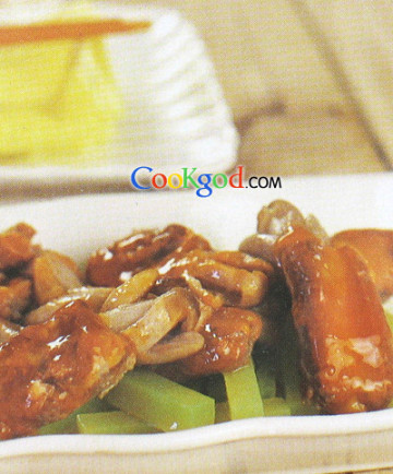 鸡腿菇150克,猪寸骨300克,绿笋200克,葱段少许。调料橙汁2大匙,精盐1小匙,白糖、甜醋各2小匙,料酒1小匙、清汤1杯,水淀粉,色拉油各少许。