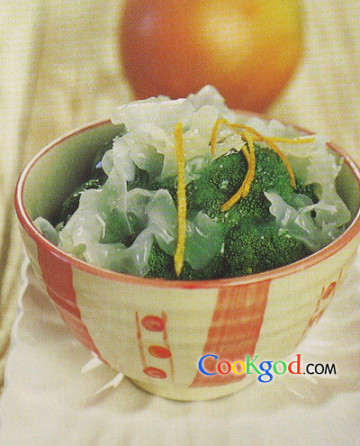 2、锅入橄榄油烧热,倒入奶汤、银耳、精盐、白糖调味,水淀粉勾薄芡,淋在西兰花上,撒上柠檬丝即可。