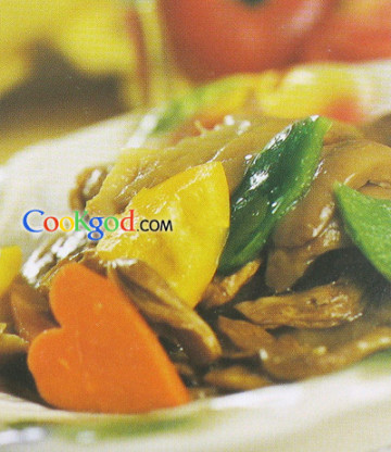 2、净锅置火上,入色拉油烧热,炒香葱姜末,下入原料和酱油、甜面酱炒至上色,加入香菇水及其他调料烧至入味即可。