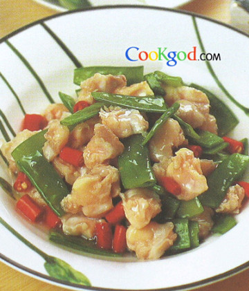 3、锅内放入底油,炒香米椒,放入荷兰豆、鸡脆骨,加入精盐、味精翻炒,用水淀粉勾芡,淋明油即成。