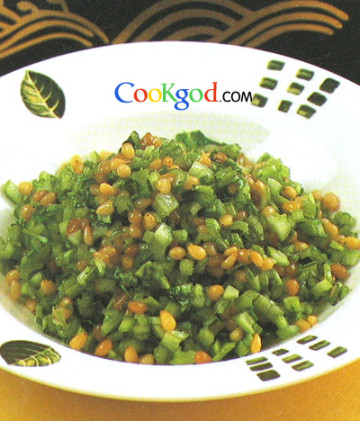 4、将备好的松仁、菜心加精盐、味精、葱油拌匀入味,装盘即成。