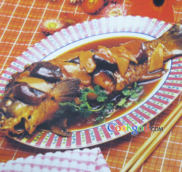 4、将炒锅置武火上,放入花生油烧热,下入鲤鱼炸成金黄色,捞出滤去油。另起锅置火上,放入猪油、猪肉片、白糖,炒成枣红色时,放入炸好的鲤鱼,党参、黄芪片同时下锅,加精盐、水适量,烧开后,移文火上,煨至汤浓,鱼肉熟透,将鱼捞在盘中,拣去党参、黄芪片,再放入笋片、香菇、味精烧开,用水豆粉勾芡,出锅,浇在鱼上即成。