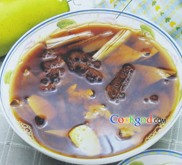 4、将猪肝片、猪胰片放入开水内汆一下,取出,放入沙锅内,加海参、鸡汤、料酒、酱油、猪油、白糖、精盐、葱、姜,用小火炖熟即可。