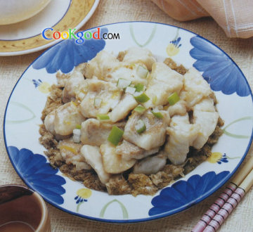 (2)、用汤6g把淀粉溶开待用,将鱼肉切成长宽各6.6cm、厚3.3cm的方块,下入烧沸的热油中滑八成熟捞出,控去油。炒锅内略留底油,上火烧热,下葱花,姜末略爆,炝入料酒,依次加放汤、食盐、白糖、味精、鱼块颠匀,勾芡,淋入香油,出锅上盘。菊花的一半放在鱼块下垫底,另一半围在盘边上即成。佐餐食用。