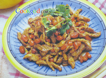 4.将炒锅烧热,放入食油,待油六成热时,放入肉丝、笋丝,煸炒片刻烹入料酒、白糖、酱油、味精,再放入枸杞子翻炒几下,淋上少许麻油,即可起锅。