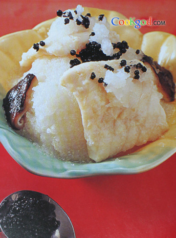3、金线鱼肉上覆上萝卜泥,一同入蒸锅,大火蒸至鱼熟,取出,再以鲑鱼卵点缀即可。