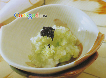 2、将白萝卜泥与芥菜末拌匀,放上鲑鱼卵即可。