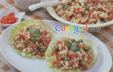2.锅中倒半杯油烧热,放入鸡肉炒熟,加腊肉、腊肠、香菇及葱术快炒,倒入b料煮至汤汁收干,加入荠和豌豆仁煮熟,再加c料炒匀,淋上d料煮匀,盛出,食用时以生菜叶包卷即可。