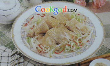 (2)鸡熟后取出切块排盘,再将葱丝、姜丝散盖在鸡肉上,同时撒上胡椒粉。