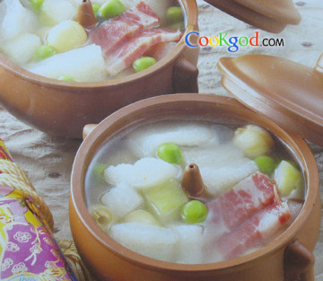 4.陶盅内放入嫩姜、竹荪、冬瓜、莲子及a料以大火煮开,改小火续煮30分钟,熄火,加入火腿片、豌豆仁,即可端出。