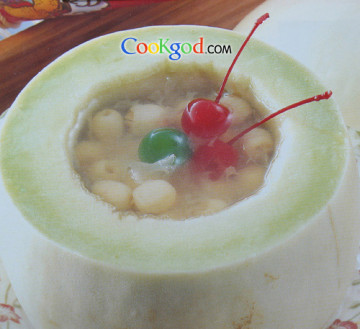 材料哈密瓜1个 新鲜莲子150克 燕窝1两约37.5克 樱桃罐头红、绿各数粒(或用红枣亦可)调味料a料:冰糖3小匙 开水1杯