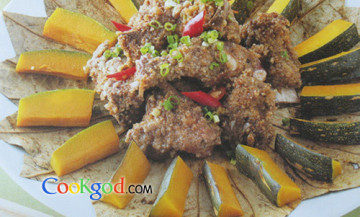材料荷叶1张 肉排600克 南瓜1/2个 大蒜3瓣 葱2根调叶料a料:糖1小匙 酱油1大匙 辣豆瓣酱2大匙 b料:蒸肉粉适量