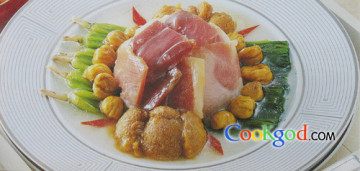 3.菠菜洗净,去根部,放入沸水中加入c料烫熟,捞出,沥干水分,排入盘中;金华火腿切片,垫入大碗中,加入猴头菇及栗子,移入蒸锅中蒸10分钟,取出,倒扣在菠菜上。
