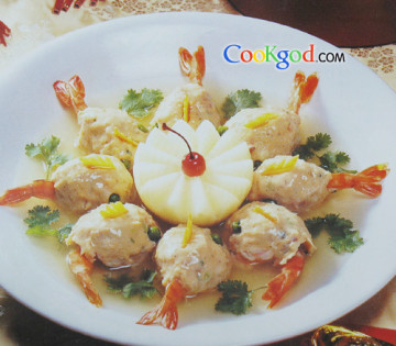 材科草虾8只 虾仁200克 鱼泥300克 葱2根 青豆仁16粒 胡萝卜20克调味料a料:盐、胡椒粉各1/4小匙 水淀粉2小匙b料:高汤1杯盐1/4小匙 水淀粉2小匙