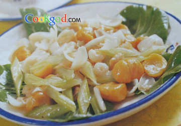 3、再加百合、西芹快炒,放盐、糖、味精勾芡后再加点明油装盘即可。