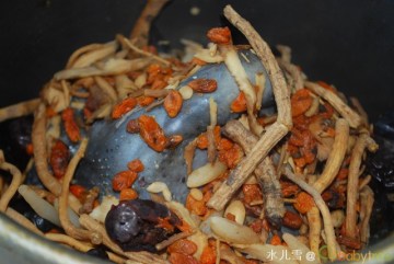 1.乌鸡可以整只煲汤,也可以剁成小块儿。我为了分食方便,就剁成了小块。美食博客空间 2.菌类的种类无限制。