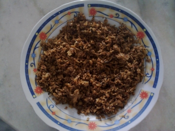 3、拌炒期间可分次入少量的油,至边边呈微焦(更加小了些)后入少量的糖、盐调味即可。