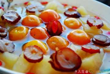 枸杞,枣片泡上。把苹果金桔放到锅里煮,大概20多分钟吧,水逐渐减少的时候,加几块白糖,再煮5分钟,出锅之前2分钟,放枸杞。就可以了。
