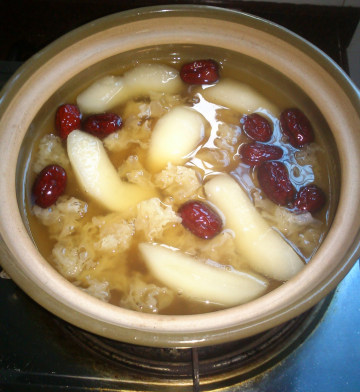 3. 将银耳,雪梨,大枣,枸杞一并放入锅中,倒入适量清水,武火烧开,文火慢炖2个小时。