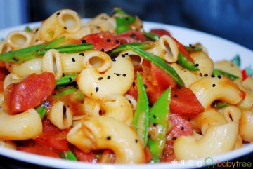 爆锅,炒西红柿和肠,2分钟后,放通心粉,荷兰豆,再炒开,调味,洒了一点黑芝麻,