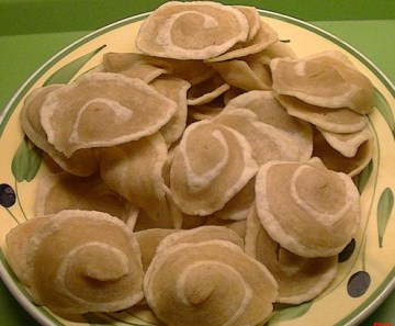 5.然后从长条上每次揪一小块(蚕豆大小就好),大拇指按扁往前一搓就是一个猫耳朵了,在案板上操作就是平的,其实我不知道为什么叫猫耳朵,我觉得即使平的也不是很象呀.我是在小扁箩里搓的,所以有条纹,我觉得很想意大利面里的那种贝壳面。