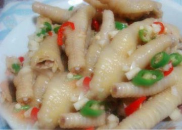 鸡脚1斤,蒜米2两,香油少许,白糖,米醋,酱油,辣椒酱,盐