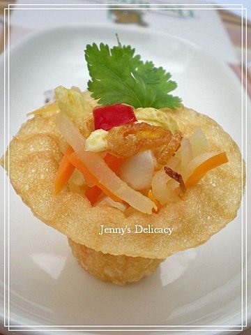 6.加入调味料,把所有材料炒熟,盛起.把1~2汤匙的馅料连少许汤汁一起装入金杯内,在金杯上面放红椒丝和一片香菜叶装饰.