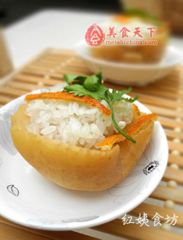 5、陈皮丝放到糯米上。