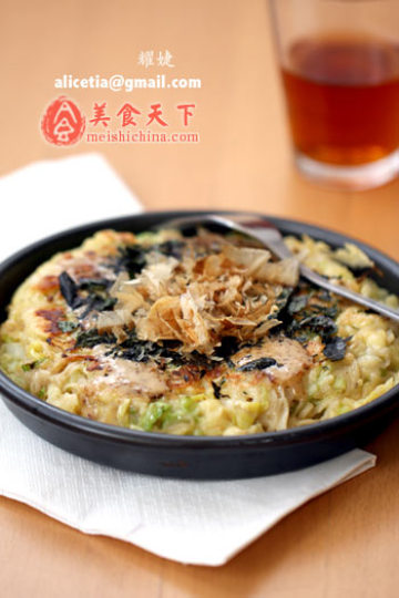 圆白菜半个、鸡蛋1个、面条1小把、生抽1大匙、盐1小匙、面粉适量、木鱼花1小撮、海苔丝1小撮、沙拉酱随意。