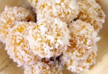 3.和成面团,取小块搓成球,表面滚上另备的椰丝;
